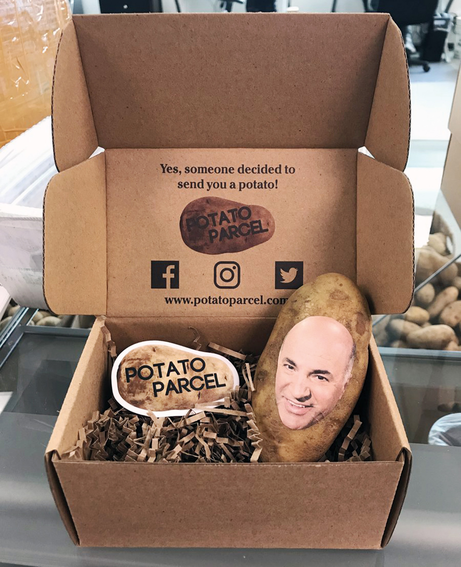 Karkoli imate povedati, povejte to s krompirjem. Letos ste že prepozni, a v prihodnje lahko namesto na papirju čestitke ali voščila pošljete napisana na krompirjevem gomolju. Pri tem morate biti ekonomični, saj sporočilo ne sme presegati 130 znakov in ga na krompir napišejo ročno. Namesto tega ali poleg tega lahko na gomolj natisnejo tudi fotografijo vašega obraza, fotografijo obraza vašega ljubljenčka ali fotografijo s počitnic. Američana Riad Bekhit in Alex Craig sta svojo poslovno zamisel pred tremi leti predstavila v resničnostni oddaji Shark tank, dobila želeno finančno injekcijo in njuna storitev, imenovana potato parcel oziroma krompirjeva pošiljka, je zacvetela. Ponujata jo tudi v Evropi, tako da lahko krompirjevo čestitko za slabih dvajset evrov s poštnino vred pošljete komurkoli v Slovenijo. Pošiljatelj lahko ostane anonimen ali ne, zavrnejo pa sporočila, ki so žaljiva ali bi lahko naslovnika prestrašila. Zaradi napisa, ki vsebuje črnilo, ter bakterij, ki bi lahko med potjo prišle na gomolj, odsvetujejo predelavo krompirjevih čestitk v hrano.