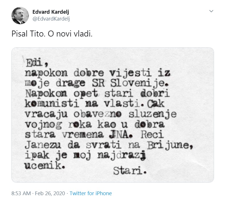 Josip Broz - Tito je ob novici o novi Janševi vladi pisal Edvardu Kardelju. Slednji je njegovo sporočilo objavil na Twitterju.