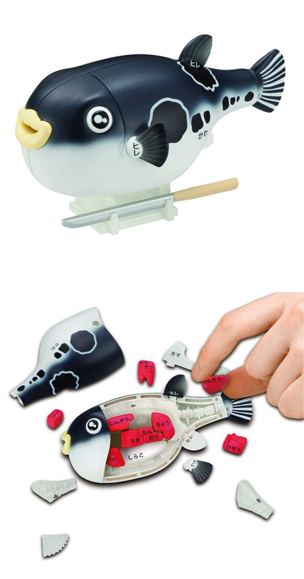 Tridimenzionalne plastične sestavljanke živali – krave, pujse, kokoši, raka in tuna – so namenjene seciranju in želijo otrokom skozi igro približati poznavanje posameznih delov živalskih teles z namenom uporabe v kuhinji. Med sestavljankami izstopa riba napihovalka, znana pod japonskim imenom fugu, katere uživanje je nekakšna ruska ruleta, odvisno od tega, koliko zaupate suši mojstru. Velja za eno najbolj smrtonosnih specialitet, saj riba vsebuje tetrodoksin, strupeno spojino, ki ohromi mišice, tudi dihalne, kar lahko povzroči zadušitev. Strup je prisoten v očeh, koži, jajčnikih in predvsem v jetrih ribe fugu, zaradi česar je v morju varna pred vsemi plenilci razen pred človekom. Kuharski mojster mora pri pripravi paziti, da s strupenimi deli ne kontaminira mesa ribe, zato je šolanje izjemno zahtevno in traja več let. S pomočjo 34-delnih sestavljank, ki jih izdeluje japonsko podjetje Megahouse, lahko zdaj za fugu suši chefe začne vaditi že mladež, priporočajo starost najmanj šestih let. V kompletu so še krožnik, stojalo, mini plastični nož za razkosavanje in lažni certifikat o mojstrstvu priprave ribe fugu.