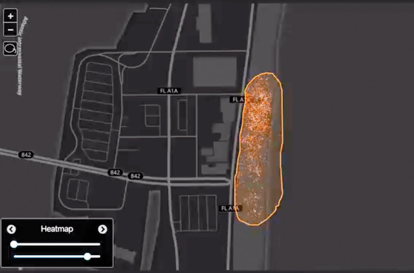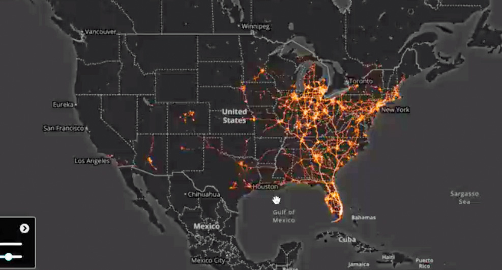 Primer uporabe mobilnih lokacijskih podatkov: leva slika prikazuje skupino mladostnikov, ki so se marca letos zabavali na obali Floride, ZDA. Desna slika pa, kam so se kasneje ti posamezniki razkropili. Vsaka pika predstavlja mobilni telefon. Podjetje je podatke kupilo od ponudnikov aplikacij za mobilne telefone, recimo aplikacij, ki prikazujejo vreme, a si hkrati zapomnijo položaj uporabnika.