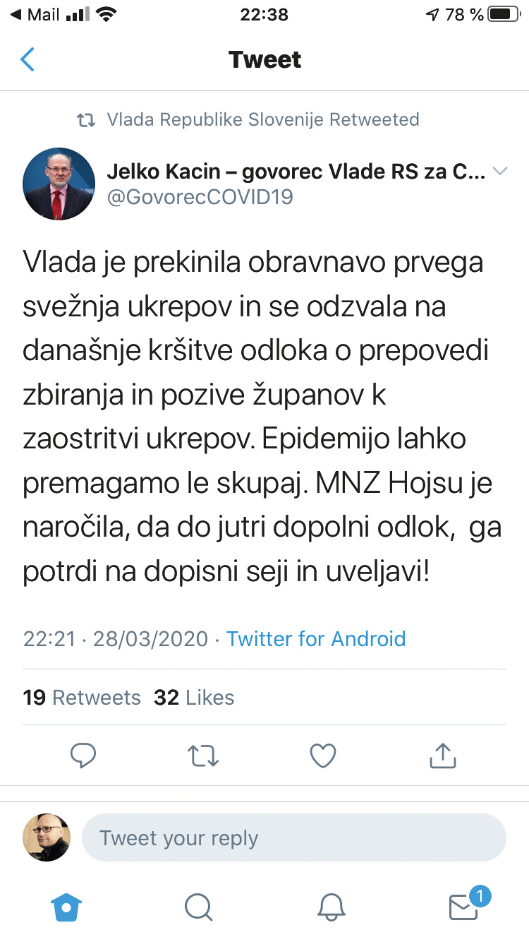Tvit vladnega govornika Jelka Kacina, v katerem je napovedal zaostritev karantene, ker se ljudje domnevno niso držali vladnih zapovedi.