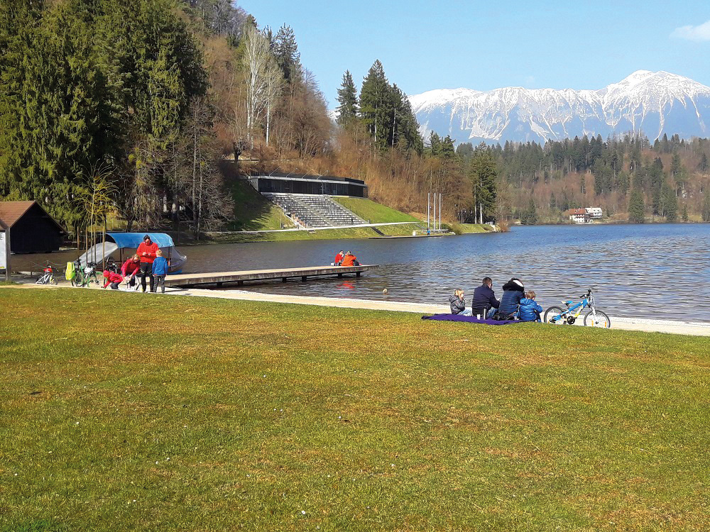 Fotografija občine Bled, ki naj bi dokazovala gnečo sprehajalcev to soboto ob Blejskem jezeru.