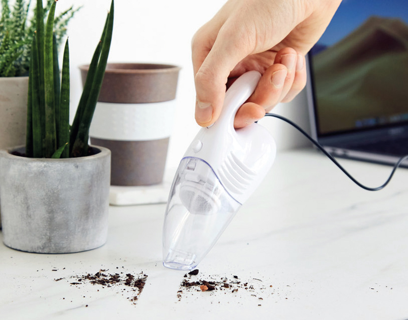 Etruščanska rovka je s svojimi petimi centimetri dolžine in dvema gramoma telesne teže najmanjši sesalec pri nas, če seveda govorimo o živalskih vrstah. Najmanjši sesalec med pripomočki za čiščenje pa je malo večji in v dolžino meri približno toliko kot manjša odrasla dlan. Z njim lahko uspešno odstranimo drobtine kruha, ki zaidejo med tipke na računalniški tipkovnici, delčke piškotov, ki se valjajo po kavču, ostanke šiljenja na mizi, drobce raztresene prsti, papagajeve kakce ali bleščice na najljubši črni srajci. Namenjen je predvsem za namizno uporabo, zato je verjetno sprejemljivo, da deluje le prek USB-priključka na računalniku in ni brezžičen, pri čemer ima kar 120 centimetrov dolg kabel, kar zadošča za to, da z njim posesamo računalnikovo bližnjo okolico. Mini sesalec za svoje delovanje ne potrebuje vrečk, njegovo prosojno posodo enostavno izpraznimo v smeti, ko se napolni. Vsebuje tudi filter za večkratno uporabo in dva dodatna nastavka, od tega enega s krtačko. Izdelujejo jih v modri, rdeči ali beli različici, pri čemer pa je barva izdelka določena na slepo in je ne moremo zares izbrati ob naročilu.