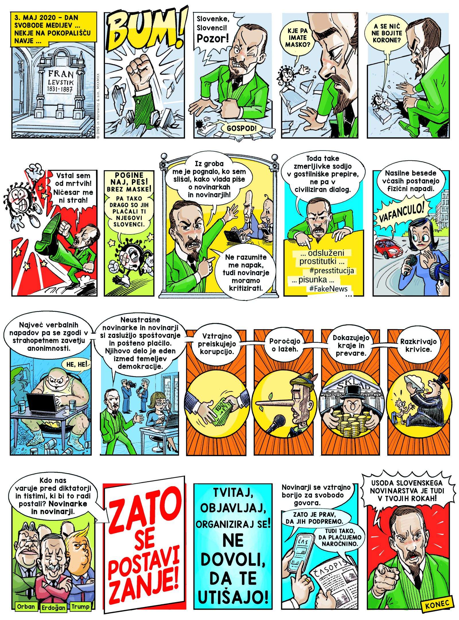 V sodelovanju z ilustratorjem Cirilom Horjakom smo se v Društvu novinarjev Slovenije ob letošnjem 3. maju odločili, da objavimo strip, ki preprosto in kompleksno hkrati nagovori opisane razmere v medijih in novinarstvu, obenem pa upamo, da spodbudi tudi javnost – da kritično presoja in soodloča, v kakšni družbi želimo živeti.