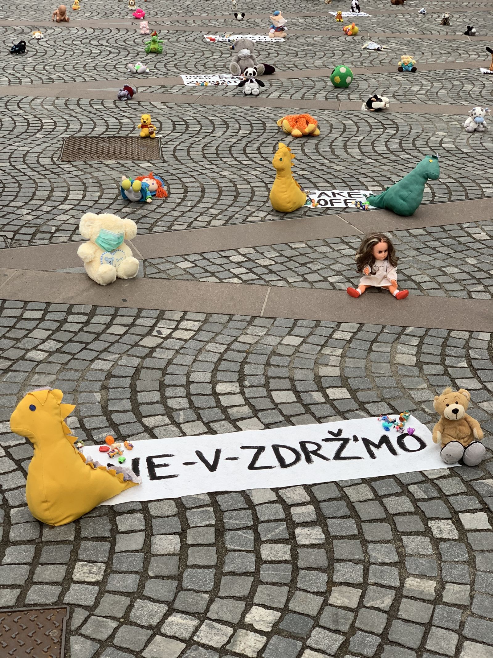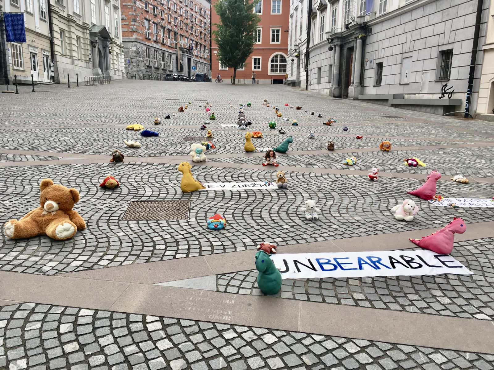 Umetnici Nika Rupnik in Helena Tahir sta v središču Ljubljane postavili ulično intervencijo s plišastimi in drugimi otroškimi igračami, ki simbolizira protestni shod. S tem sta želeli opozoriti na trenutno dogajanje po svetu. Intervencija je bila namenjena naključnim mimoidočim, ki so lahko igrače tudi odnesli domov.