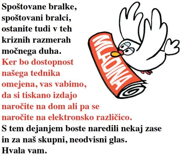 Naročnina na Mladino je enostavna, odjavite se lahko kadarkoli, dostavimo tudi v karanteno! Vse informacije dobite na naši spletni strani www.mladina.si/narocnina. Lahko nam tudi pišete na e-naslov narocnine@mladina.si ali na poštni naslov Mladina, Dunajska 51, Ljubljana. Dosegljivi smo tudi na telefonski številki 01 230 65 30.