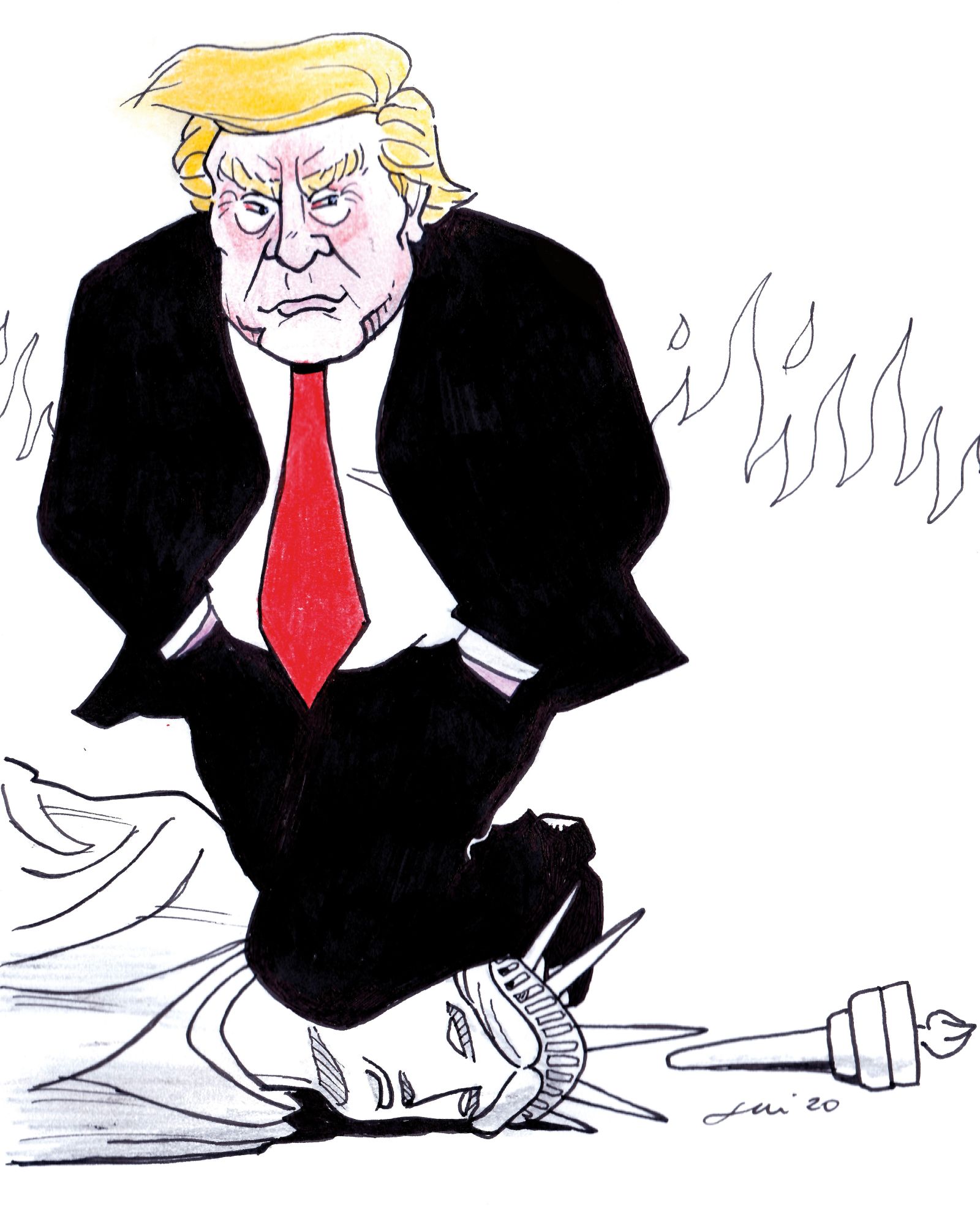 Ameriške guvernerje je najprej poučil, da morajo na ulicah »dominirati« (»Ljudi morate aretirati, jim soditi in jih zapreti za deset let, pa se to ne bo več dogajalo«), potem pa jim je zapovedal, da morajo vpoklicati nacionalno gardo – in to obvezno. »Če kdo tega ne bo storil, bom jaz tja poslal vojsko. Pa bodo vsi njihovi problemi takoj rešeni.« Vojsko? So to besede novega diktatorja? Prav takšne krize – takšni popolni viharji kriz – rojevajo diktatorje. Diktatorje, ki nad neoborožene pošiljajo vojsko. Neki protestnik je kriknil: »Živimo v deželi tretjega sveta!« Lucian Truscott IV (Salon) pa je dodal: »Le še en strel nas loči od tega, kar se dogaja v Kabulu, Mogadišu in Tripoliju.« In Trump počne prav to: ameriška mesta spreminja v bojišča. V Kabule, Mogadiše in Tripolije. Trump podžiga nasilje. Hoče ga. Terja. Poziva k nasilju. Ja, Trump, ki za 110 tisoč mrtvih krivi Obamo, je pravi požigalec. Piroman-in-chief. Raje zažge Ameriko, kot pa da bi jo izgubil!