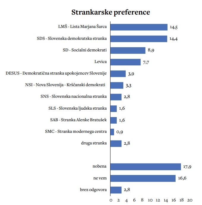Ali konkretno: pri merjenju strankarskih preferenc – gre za kombinacijo vprašanja, katero stranko bi volili in katera stranka je anketirancu bližja kot preostale – se izkaže, da največja vladna stranka SDS ni politični hegemon. Po raziskavi političnih preferenc SDS podpira 14,4 odstotka vprašanih, kar je za kanček manj kot LMŠ, ki je dobila podporo 14,5 odstotka. Obe stranki sta pri tem vprašanju praktično izenačeni.