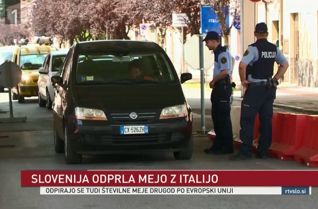 (Na nekdanjem maloobmejnem prehodu med obema Goricama, na Erjavčevi ulici so v ponedeljek, 15. junija pripravili slovesnost ob ponovnem odprtju meje med obema državama, župana obeh Goric, Klemen Miklavič in Rudolfo Ziberna pa sta prerezala trak, ki je simbolično ločeval meji; via RTV SLO)