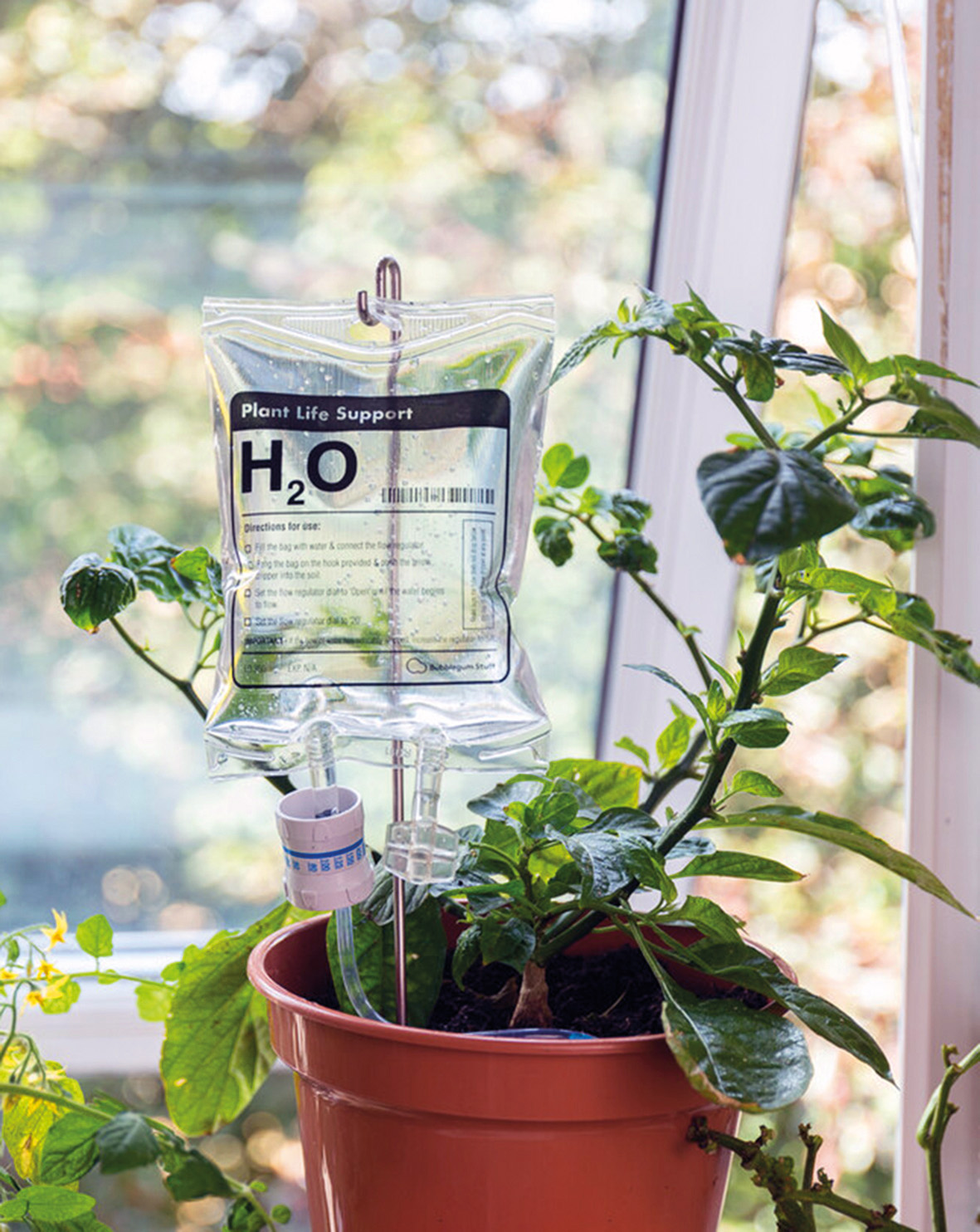 Da bi zagotovili ohranjanje življenjskih funkcij sobnih rastlin, medtem ko ste na dopustu, morate prej poskrbeti za to, da bodo kljub vaši odsotnosti redno zalite. Kar pomeni, da morate komu zaupati ključ stanovanja oziroma hiše ali namestiti sistem za avtomatsko zalivanje. Tudi če ste zaradi svoje vneme, pozabljivosti ali neznanja s prepogostim ali preredkim zalivanjem ugonobili prenekatero lončnico, boste veseli novega pripomočka, ki bo z rednim dovajanjem ravno pravšnje količine vode namesto vas skrbel za žejne rastline. Kot nalašč za poletne mesece se je prejšnji teden na tržišču pojavila infuzija za lončnice, za samodejno zalivanje rastlin, poimenovana plant life support. V prozorno vrečko, na katero nataknemo cevko, nalijemo vodo in vrečko obesimo na stojalo. Tega zapičimo v zemljo ob lončnici, enako tudi plastično konico, ki je na koncu cevke. Odpremo regulator pretoka vode na cevki, dokler voda ne začne teči, in nastavimo želeno hitrost pretoka. Idealno za zalivanje med krajšim dopustom, ob daljši odsotnosti pa vseeno potrebujemo nekoga, ki bo izpraznjeno vrečko ponovno napolnil z vodo.