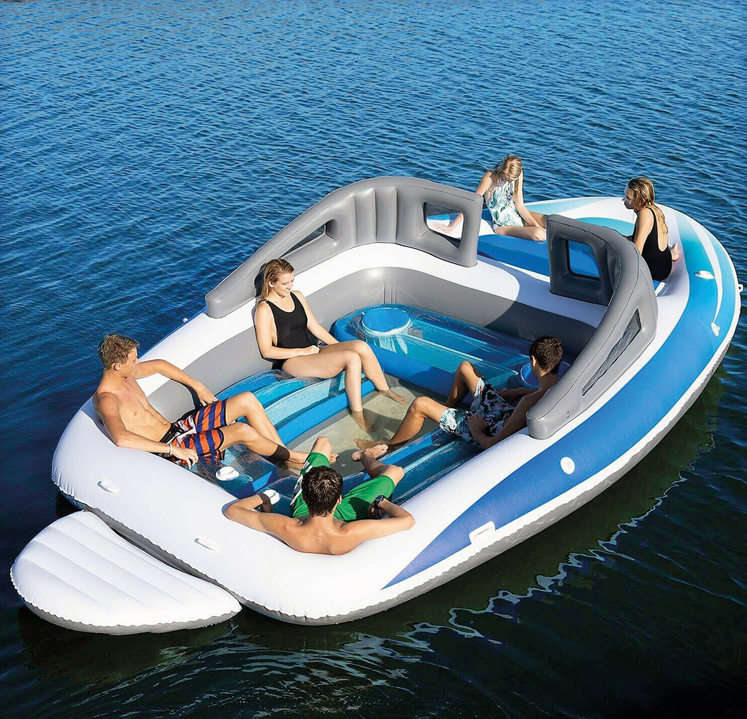 Videti je kot pravi gumijasti čoln, tudi napihljiv je kot gumenjak, a naj vas videz ne zavede, to je namreč gliser, ki ne gre nikamor in na katerega motorja ni mogoče montirati. Zato tudi ne potrebuje goriva in ne svinja okolja, vsaj nič bolj kot ostali plastični napihljivčki. Ta z zrakom napolnjeni plavajoči otok je namenjen zlasti posedanju in ležanju na kakršnikoli vodni površini, zato lahko z njegovo pomočjo vsaj malo kompenziramo majhnost slovenske riviere ter odsotnost dejanskih otokov. Nanj se lahko udobno namesti šest odraslih, stane nekaj več kot tristo evrov in ga je skoraj tako težko spraviti v vodo kot dejanski čoln, saj že nenapihnjen tehta trideset kilogramov. Če ga v vodi ne zasidrate, boste za krmarjenje potrebovali vesla, sicer bi lahko udarili v skale ali kaj podobnega, kar bi znalo preluknjati ne ravno debelo in bojda ne najbolj trpežno plastiko. Napihljivi gliser vsebuje tudi poseben prostor s pokrovom za shranjevanje pijače in kar osem držal za pločevinke, tako da boste lahko s pivom pogostili še mimoidoče plavalce ali sosede – uporabljati ga je namreč mogoče tudi na travniku ob hiši –, medtem ko bodo občudujoče strmeli vanj.