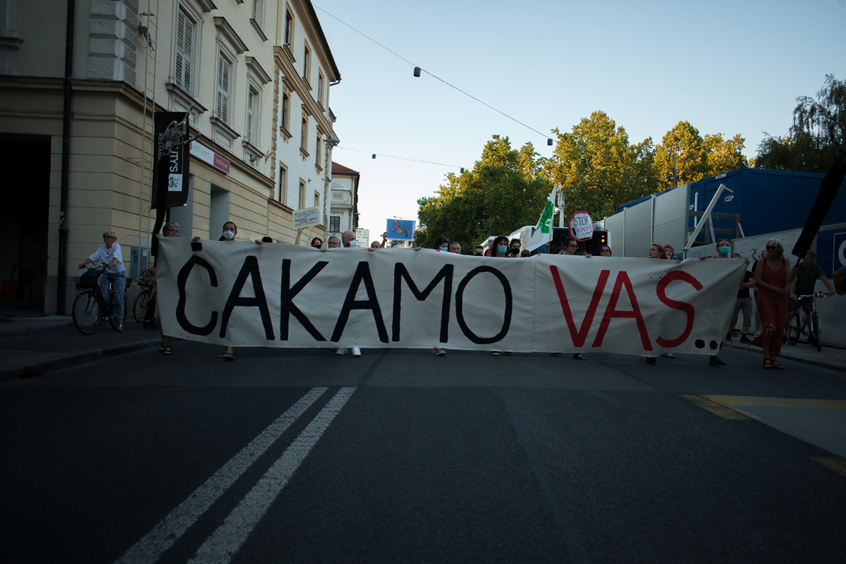 Po govorih so se protestniki, ki naj bi se jih po ocenah udeležencev zbralo okoli 3000, v povorki odpravili po ulicah središča Ljubljane. Ustavili so se tudi na Gregorčičevi ulici pred poslopjem vlade, kjer so nadaljevali z nagovori, na asfalt pred vladnim poslopjem pa so prilepili tudi papirnate odtise stopal.