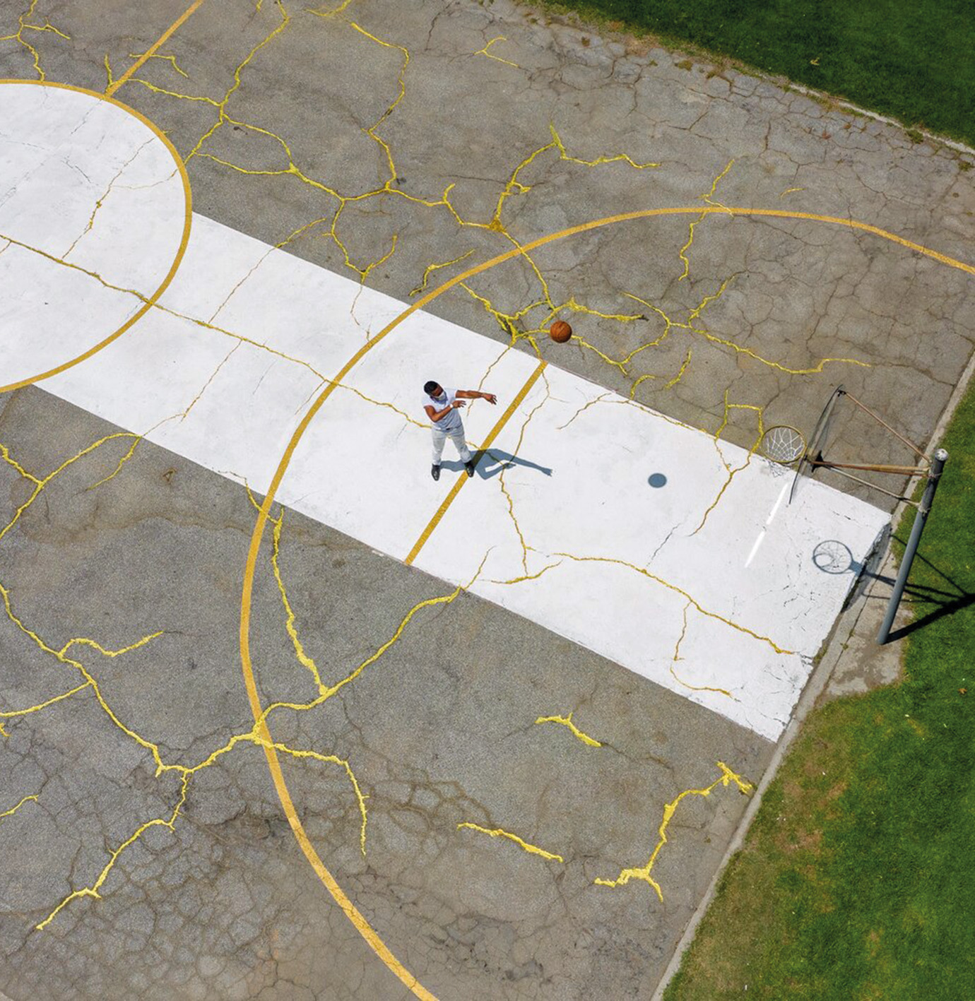Victor Solomon je sodobni umetnik iz ZDA, ki v svojem dolgoletnem projektu literally balling – v urbanem besednjaku balling pomeni bogat, razkošen, nanaša pa se tudi na besedo ball, žoga – raziskuje razkošje, njegovo ironičnost in nepraktičnost, ter ga aplicira na košarkarske artefakte. Tako je v zadnjem desetletju ustvaril vrsto steklenih vitražnih košarkarskih tabel, obroče na njih pa opremil z mrežami, ki niso spletene iz vrvi, temveč jih sestavljajo nanizane kristalne koralde, kot pri lestencih, ali zlate verižice. Pred kratkim je pozlatil razdrapano igrišče za košarko v južnem predelu Los Angelesa; s sodelavci je največje razpoke v asfaltu igrišča po vzoru tehnike kintsugi zapolnil s smolo z dodanim zlatim prahom. Kintsugi je starodavna japonska tehnika popravljanja razbitih keramičnih posod, pri katerih koščke zlepijo skupaj z lepilom, smolo oziroma lakom, ki so mu primešali prah žlahtnih kovin; tako razpok oziroma nepravilnosti sploh ne skrijejo, temveč poskrbijo, da ostanejo dobro vidne, da izstopajo. Solomon je želel z instalacijo poudariti pomen in moč košarke kot splošno dostopnega športa, ki se požvižga na razlike med rasami ali razredno razslojenost, ki ljudi zdravi in jih združuje, kar se mu zdi še posebej pomembno v razdvojenem in negotovem času, v katerem smo se znašli.