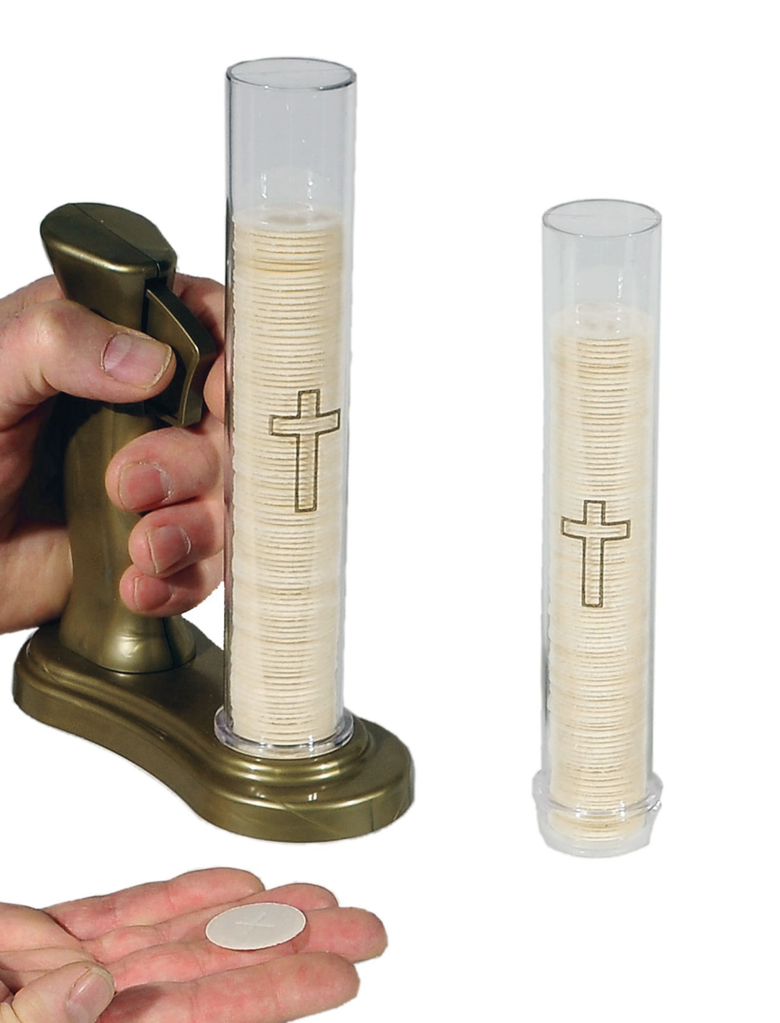 Ukrepi za zajezitev novega virusa so doleteli tudi božje hrame. Ne gre le za zaščitne maske in predpisano distanco. Blagoslovljeno vodo boste trenutno v kropilnikih ob vhodu v cerkve zaman iskali, duhovniki pa morajo hostijo, ki predstavlja Kristusovo telo, vernikom položiti izključno v dlan in nikakor ne v usta; prej so lahko hostijo dali na jezik vsem odraslim vernikom, ki so to želeli, ter vsem otrokom, ki še niso prejeli zakramenta birme, kar se zgodi okoli trinajstega leta. Pred deljenjem svetega rešnjega telesa in po njem pa si mora duhovnik do nadaljnjega razkužiti roke. Ameriško podjetje, ki oskrbuje cerkve po vsem svetu, prek spleta že od predpandemijskih časov ponuja brezstični plastični razdelilnik hostij, ki higieno ob prejemanju obhajila ’na roko’ popelje še na višjo raven. Z njim duhovnik hostijo v dlan vernika položi s pritiskom gumba na držalu, ki rahlo spominja na joystick, in je povezano s prozorno tubo s hostijami. Obstaja tudi kar nekaj različic razdelilnikov svete vode, ki delujejo na senzor, podobno kot brezstična razdelilna posoda za milo v sanitarijah.