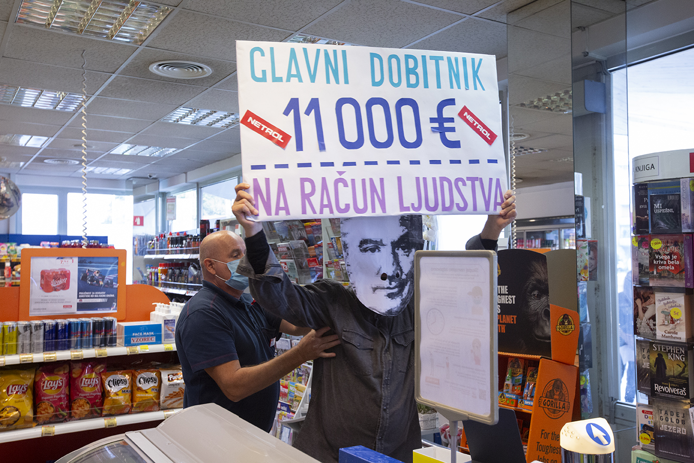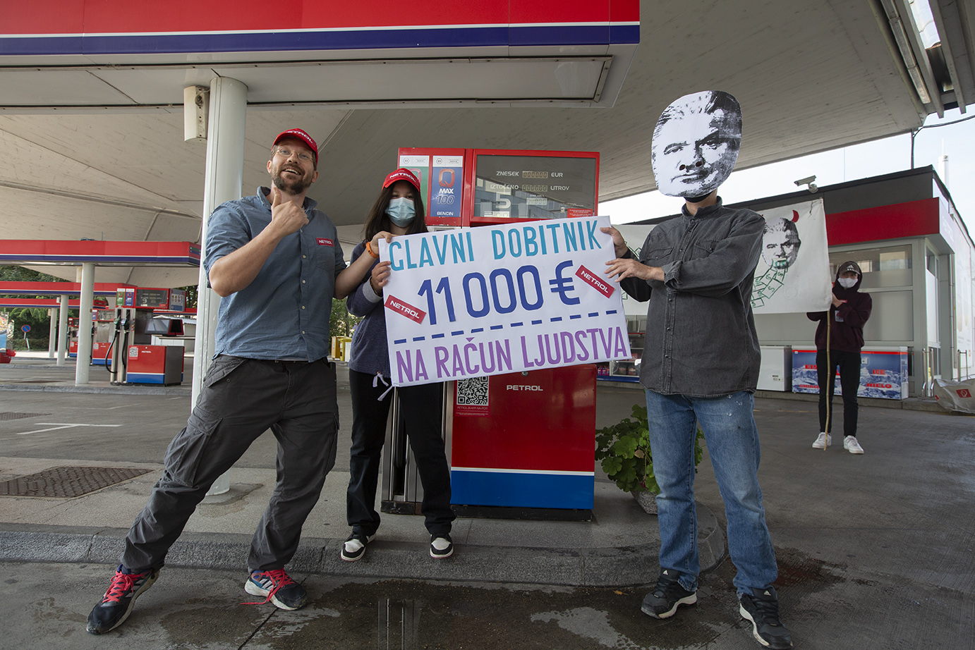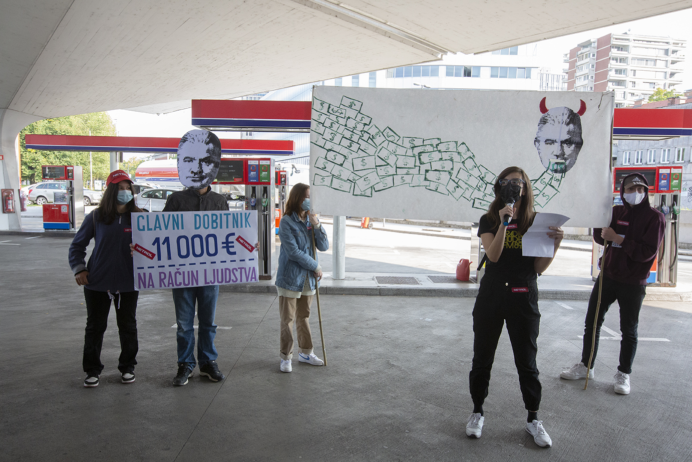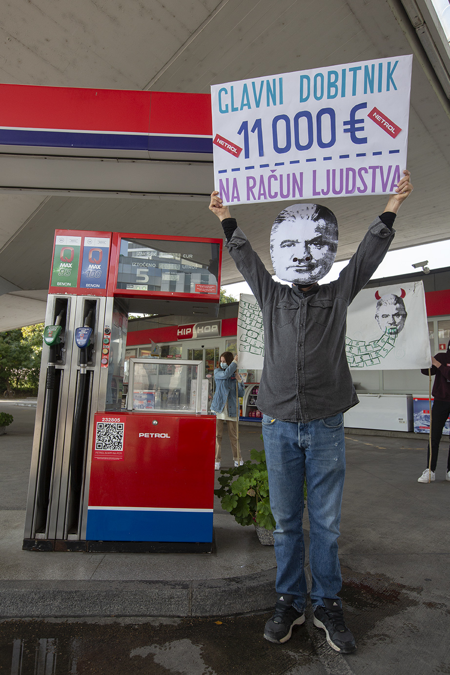 FOTOGALERIJA: Protest na bencinski črpalki zaradi ministrovega nakupa delnic Petrola