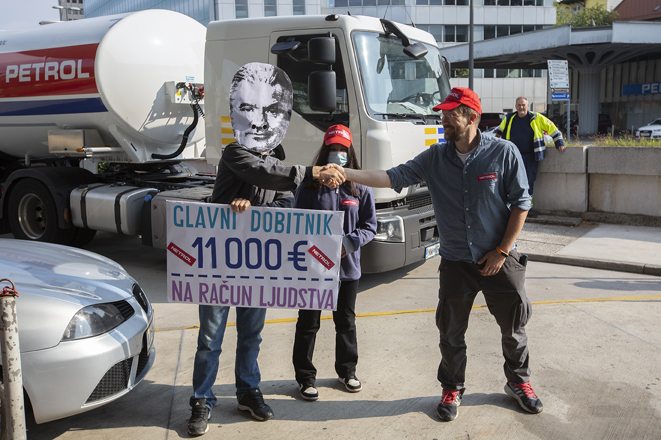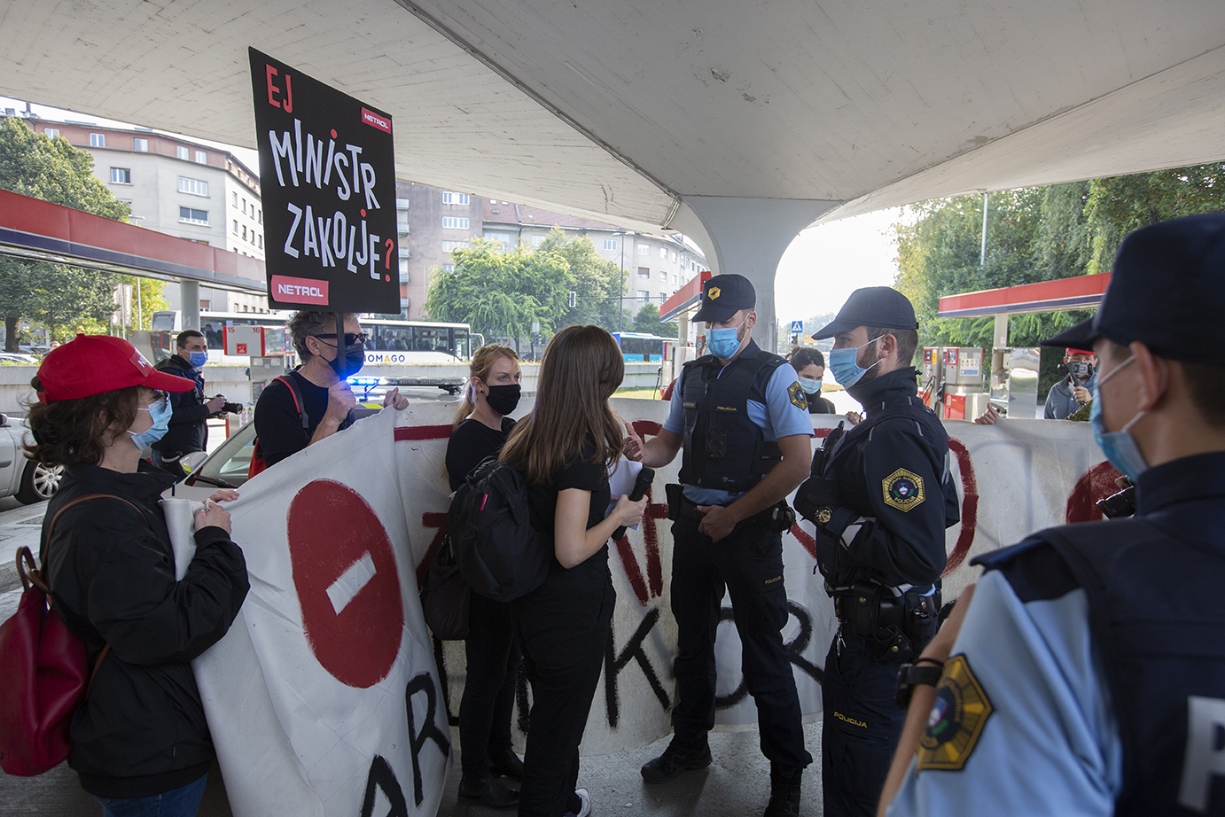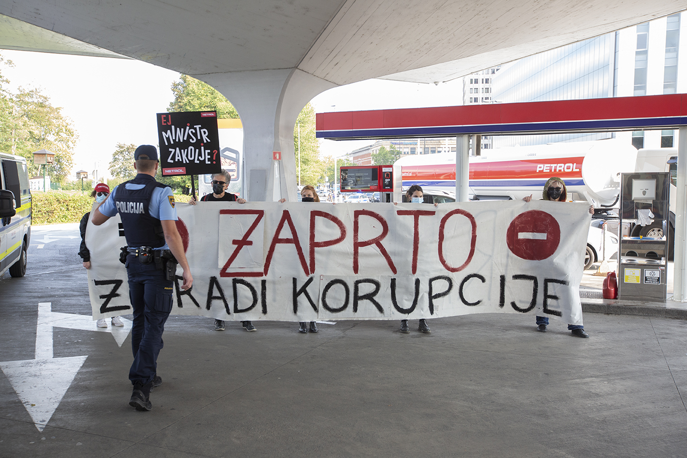 Na bencinskem servisu Petrola ob Tivolski cesti v Ljubljani je včeraj popoldne potekal manjši protest, v katerem je sodelovalo tudi nekaj znanih obrazov rednih petkovih protestov v prestolnici. Razlog je bil nakup večjega paketa delnic Petrola, ki ga je izvedel minister za okolje Andrej Vizjak. Okoli deset protestnikov je za krajši čas preprečilo uvoz vozilom na bencinski servis. V rokah so držali transparent: "Zaprto zaradi korupcije." Po nekaj minutah je prišla policija in protestniki so se umaknili.