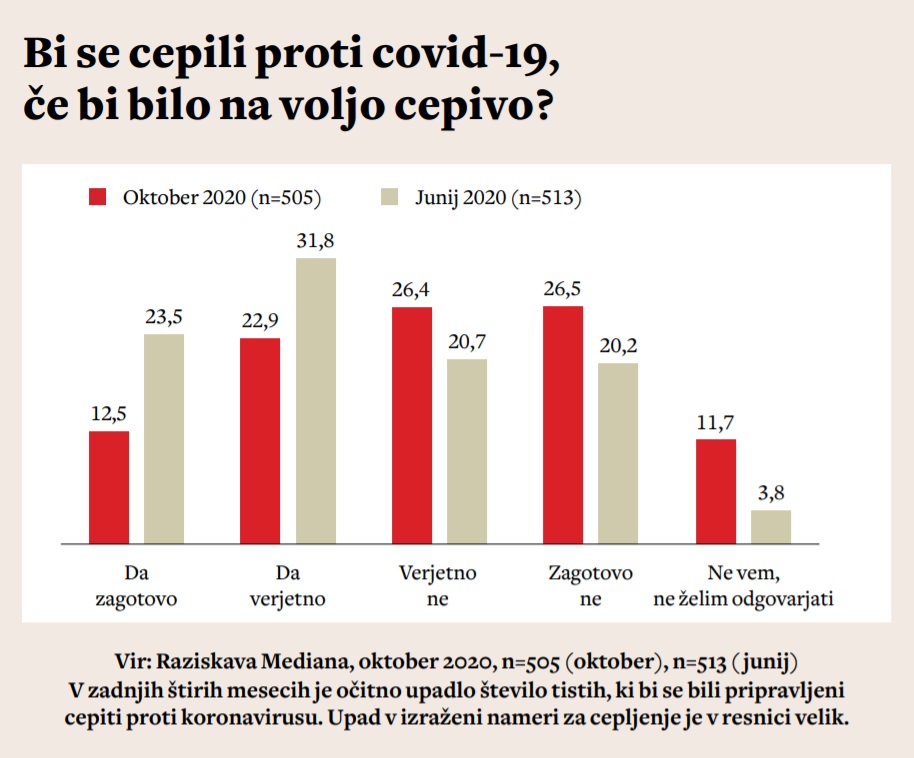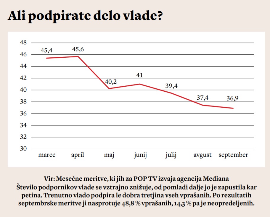 V Sloveniji je zgodba drugačna. Priljubljenost vlade je nizka, po rezultatih septembrske ankete Mediane jo podpira le 36,9 % vprašanih, nasprotuje pa ji 48,8 %. Če k nezaupanju dodamo vse sporne politične poteze te vlade – naj bodo povezane z epidemijo, recimo neodgovorno obnašanje vladnih ministrov, ki so se še pred kratkim sprehajali brez mask, notranji minister Aleš Hojs pa je v parlamentu pred kamerami celo tarnal, da z masko zelo težko govori, ali z drugimi spornimi političnimi projekti, recimo s poseganjem v medijsko svobodo in z napadi na neodvisnost sodstva –, postane jasno, zakaj imajo razni potrči in drugi zanikovalci vedno več podpornikov.