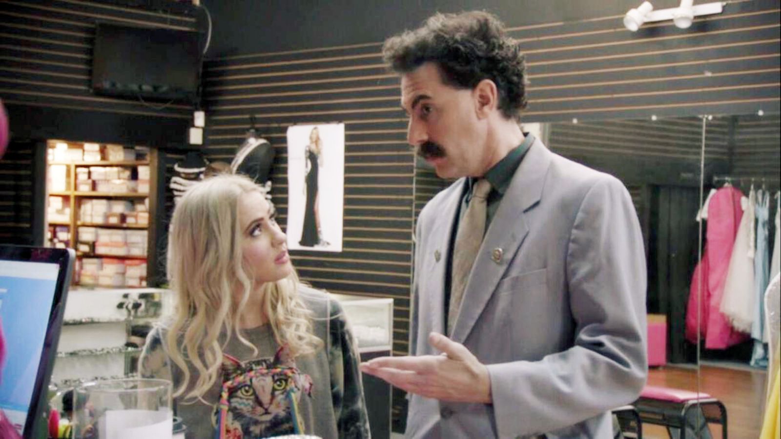 Borat, ki se je pred štirinajstimi leti norčeval iz Busha in njegovih volivcev, se tokrat norčuje iz »McDonalda Trumpa« in njegovih volivcev