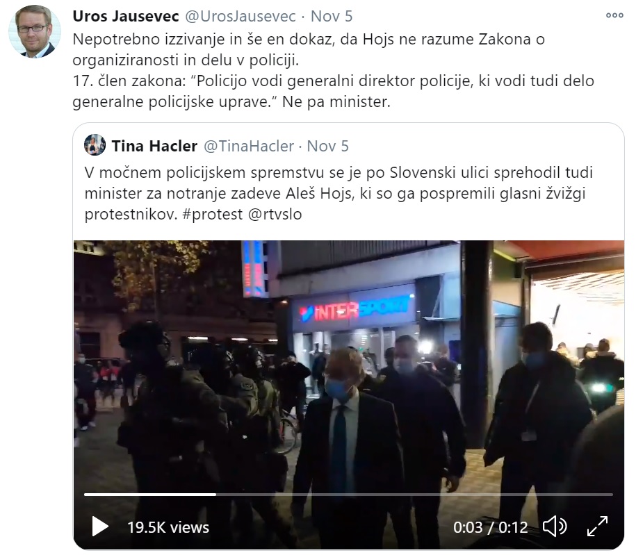 Janša je na Twitterju že četrtek zvečer izrazil podporo policiji za njeno "profesionalno opravljeno delo, za varovanje premoženja in ljudi". Zapisal je tudi, da so mirni protesti, ko ni epidemije in nevarnosti okužb, ustavna pravica. "Razgrajanje in fizično nasilje ter napadi na policiste pa so vedno in povsod kriminalna dejanja, ki bodo kaznovana," je dodal.