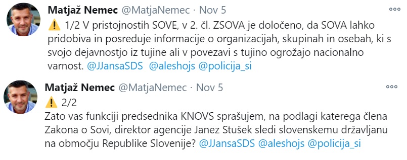 Nemec je že v četrtek na Twitterju Janšo in ministra za notranje zadeve Aleša Hojsa spraševal, na podlagi katerega člena zakona o Sovi direktor agencije Stušek sledi slovenskemu državljanu na območju Slovenije. Danes pa je napovedal sklic seje Knovsa za prihodnji petek. "Kot predsednik vlade imate odgovornost, da pojasnite vlogo Sove na protestih in na kateri zakonski podlagi vas je direktor Sove Janez Stušek obveščal o dogajanju na zadnjem nasilnem protestu v Ljubljani," je zapisal na Twitterju.