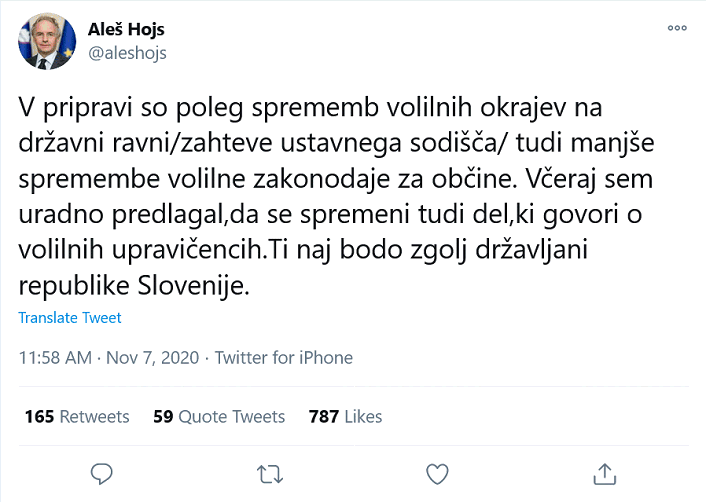 Poslanec SD Marko Koprivc je na ministra za notranje zadeve Aleša Hojsa pred nekaj dnevi naslovil poslansko vprašanje v povezavi z »nepoznavanjem prava EU«. Sedmega novembra 2020 je Hojs na družbenem omrežju Twitter zapisali, da se pripravljajo »tudi manjše spremembe volilne zakonodaje za občine«, dan pred pa je »uradno predlagal, da se spremeni tudi del, ki govori o volilnih upravičencih. »Ti naj bodo zgolj državljani republike Slovenije,« je dodal.