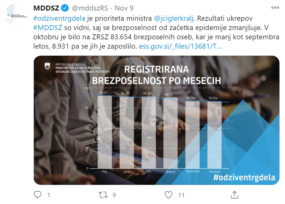 Na uradnem profilu ministrstva za delo, družino, socialne zadeve in enake možnosti so 9. novembra tvitnili, da so rezultati njihovih ukrepov vidni, saj se brezposelnost od začetka epidemije zmanjšuje.