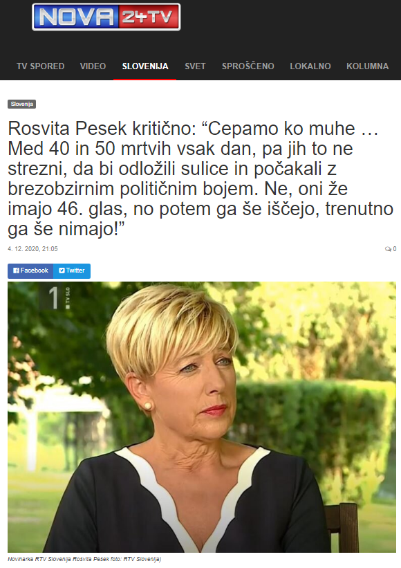 Televizijska voditeljica na TV Slovenija Rosvita Pesek je zaradi svoje kritike alternativne vlade bila takoj deležna panerigične podpore, seveda povsem pričakovane, na strankarskem portalu Nova24TV.