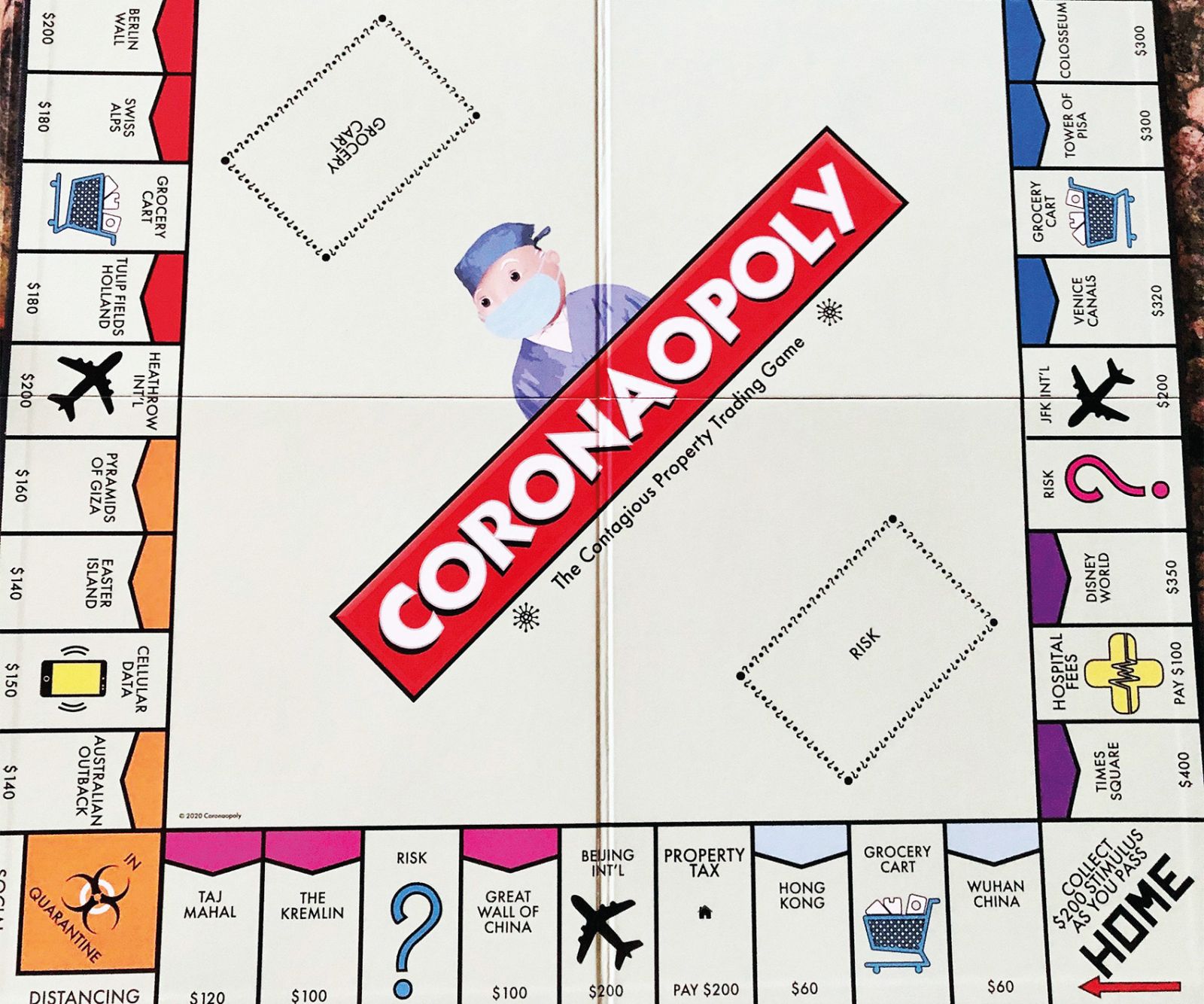 Monopoli je skupnost igralcev namiznih družabnih iger uvrstila med 20 najslabših iger vseh časov, kljub temu pa še vedno vznikajo nove in nove različice; letos na primer britanski lockdownopoly in ameriški coronaopoly, ki sta naprodaj prek spletne platforme etsy. Prvo polje koronskega monopolija iz ZDA je, kot se za pandemijo spodobi, kitajsko mesto Wuhan. Sledijo mu znamenite svetovne destinacije v takem vrstnem redu, kot se je širil virus, od Velikega kitajskega zidu, moskovskega Kremlja, avstralske divjine, prek piramid v Gizi, polj tulipanov na Nizozemskem, čez švicarske Alpe in Berlinski zid do rimskega Koloseja, Tadž mahala, Dubaja in newyorškega trga Times Square na koncu. Prisvojimo si lahko tudi polja, kot sta zakup mobilnih podatkov in naročnina na kabelsko televizijo, ter se skeširamo pri plačilu bolnišničnih pristojbin ali davka na nepremičnine. Namesto kotnega polja, ki se mu v klasični različici reče ’zapor’, imamo v koronski različici karanteno. V kompletu so žal le igralna podlaga in karte; denar, figurice, kocko, hiške in hotele, po želji pa tudi škatlo za shranjevanje morajo igralci priskrbeti sami.
