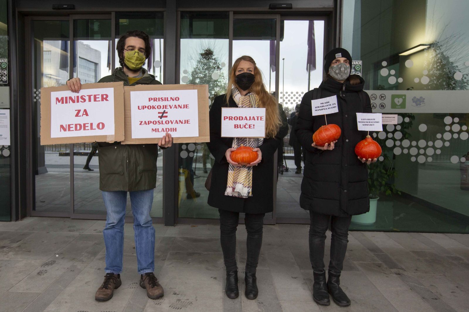 Upokojevanje starejših delavcev, kot ga določa sedmi protikoronski zakon, ne bo v ničemer pripomoglo k povečanju zaposlitvenih možnosti za mlade, so prepričani v Sindikatu Mladi plus. Ministrstvu očitajo, da zavajajo in manipulirajo. Na ministrstvo za delo so danes tudi vrnili "buče, ki jih minister prodaja javnosti".