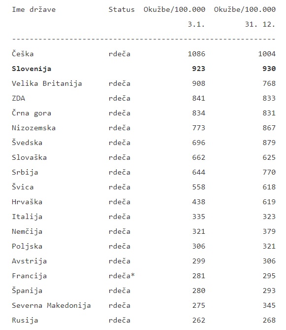 V zadnjem obdobju so se razmere v pandemiji covida-19 nekoliko spremenile, ponekod na bolje, drugod, denimo v Veliki Britaniji, na slabše. V Sloveniji je prišlo do minimalnega izboljšanja. Po novem je na drugem mestu med opazovanimi državami, za Češko, medtem ko je bila prejšnji teden na prvem. Sloveniji sledijo Velika Britanija, ZDA in Črna Gora.
