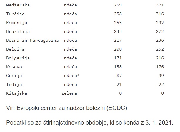 STA objavlja tabelo s podatki o epidemiološkem statusu in številu okuženih z novim koronavirusom na 100.000 prebivalcev za izbrane države po svetu. Podatki so za 14-dnevno obdobje, ki se je končalo 31. decembra, in za 14-dnevno obdobje, ki se je končalo 3. januarja 2021.
