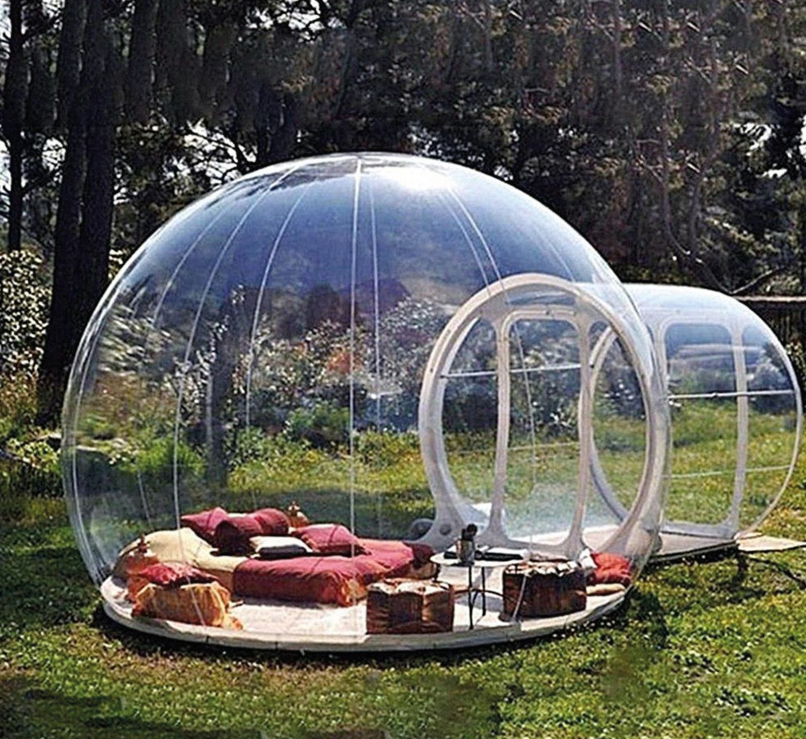 Napihljivi prozorni šotor, ki spominja na iglu, je naprodaj že kakšno desetletje, sčasoma pa je zavoljo povečanja števila ponudnikov postal tudi cenovno dostopnejši. Šotorska kupola v časih, ko je beseda mehurček dobila zelo razširjen pomen, ponuja dejanski fizični mehurček oziroma pribežališče vsem, ki v času izolacije pogrešajo kotiček zase. Do plastičnega mehurčka s trimetrskim premerom, v katerem se lahko namestita dva odrasla ali nekaj otrok, vodi kratek hodnik. Čeprav je bil okrogli prozorni šotor izvorno zamišljen za taborjenje in opazovanje zvezdnega neba brez motečega mrčesa, je tovrstni glamping mogoč le, če je v neposredni bližini na voljo električna napeljava. Zadeva je namreč napihljiva in se s pomočjo črpalke za zrak sama postavi v dobrih desetih minutah, strukturo pa obdrži le, če ventilator po njej nenehno poganja zrak, sicer se hitro spet sesuje sama vase. Tako je primerna predvsem za notranje prostore, dvorišče ali vrt. Ker so njene stene popolnoma prosojne, o zasebnosti težko govorimo. Mehurček je vodotesen, ščiti pred vetrom in ima dobro akustiko, edino zunanje črpalke za zrak naj bi bile pri nekaterih ponudnikih precej glasne.