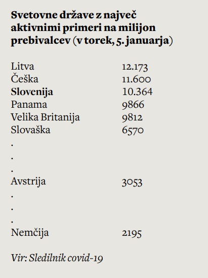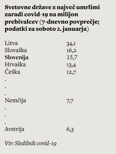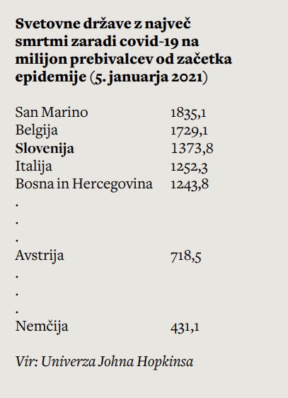 Ker se stanje ne slabša, se je izgubilo zavedanje, da je že obstoječi status quo katastrofalen. Da to ne bi smela biti nova normalnost, ki so nam jo napovedovali. Slovenija je že od novembra pri vrhu seznama svetovnih držav z najvišjim številom smrti zaradi covid-19 na milijon prebivalcev. Natanko en mesec, od 14. novembra do 14. decembra, smo neprekinjeno vztrajali na samem vrhu neslavne lestvice. Nekaj časa nam je družbo delala Češka, nekaj časa Belgija, malo tudi Hrvaška, v prvih dneh novega leta sta se nam pridružili Slovaška in Litva. Pravzaprav smo že vse od novembra med najslabšimi v prav vseh kategorijah, ki jih za mednarodne primerjave objavlja Sledilnik covid-19.