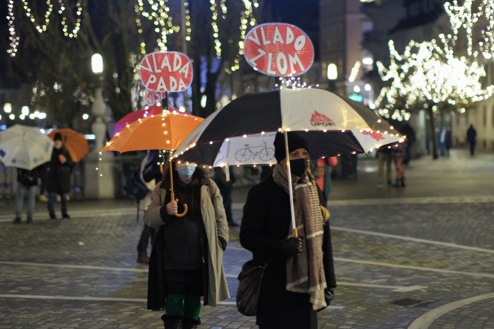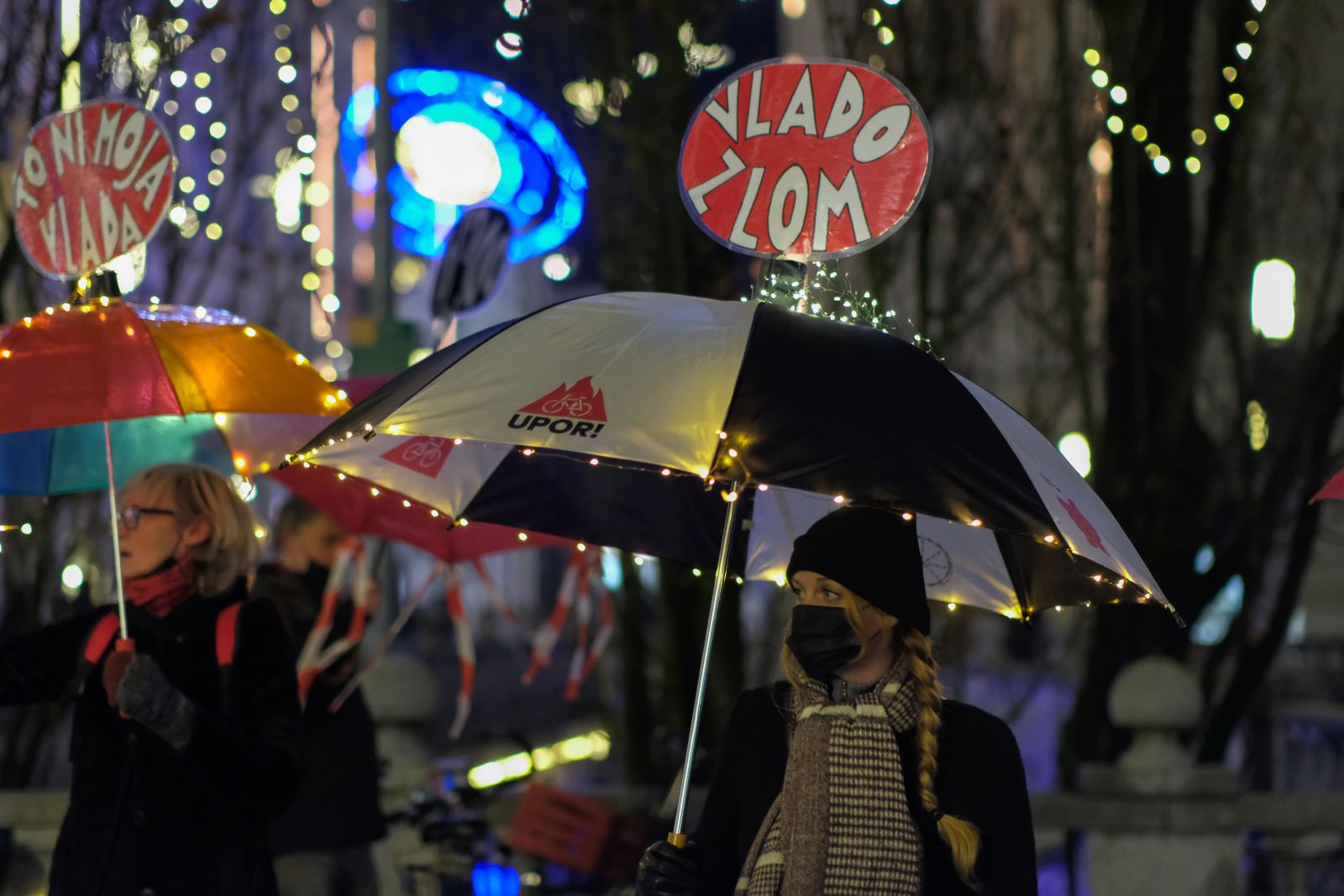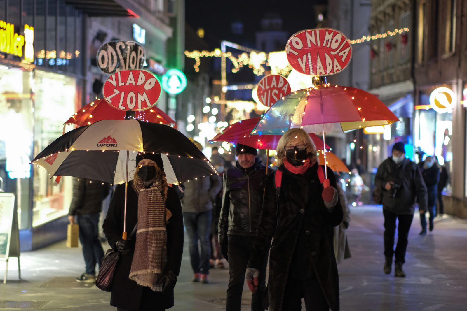 Zvečer pa so na Trgu republike pripravili Sprehod z dežnikom, na katerem so opozorili na povsem nelogične, neutemeljene in represivne postopke zoper posameznike, na katere (po političnem nareku) pristaja slovenska policija.