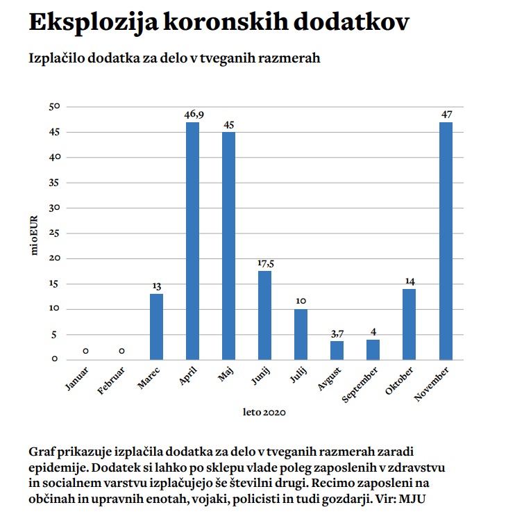 Opomba: V preglednici je zapisan povprečni znesek vseh dodatkov zaradi epidemije, ki so jih za mesec november izplačale posamezne institucije ali ki so jih dobile nekatere poklicne skupine. Številka v oklepaju je število zaposlenih na navedenem delovnem mestu ali v navedeni organizaciji. Pri vojakih, policistih ali gasilcih manjši del zneska sestavljajo še drugi dodatki, ki jih pripadniki teh poklicev dobivajo, kot so dodatek za nočno delo in delo za konec tedna, a tudi pri njih pretežni del izplačil sestavljajo izredni dodatki zaradi epidemije, predvsem dodatek za delo v tveganih razmerah. Pri organizacijah so navedeni le dodatki zaradi epidemije.