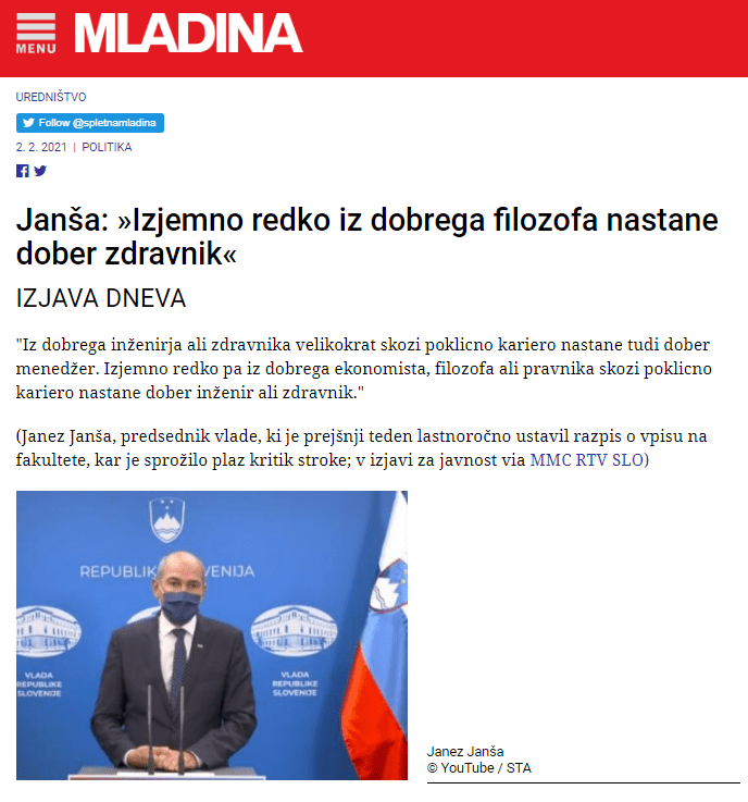 Mladina je enega od njegovih poskusov netenja spora in novih delitev povzela v naslovu: »Izjemno redko iz dobrega filozofa nastane dober zdravnik«. Slabo artikulirana poanta je jasna iz vseh kontekstov, v državi potrebujemo zdravnike in bolj evfemistično izrazje ne more prikriti, da Janšo filozofi motijo le zato, ker so filozofi.