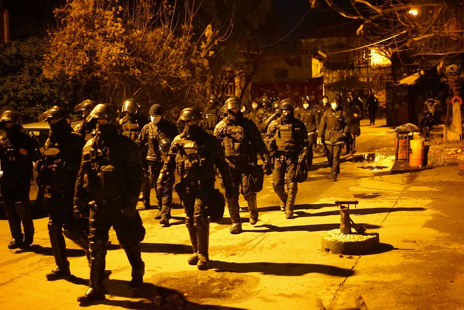 Tipičen dokaz tega sovpadanja je sinočnja intervencija do zob oboroženih posebnih enot policije, ki so po koncu mirnega pogrebnega sprevoda po nedavni izgubi našega sestrskega prostora, Avtonomne tovarne Rog, okupirale ulice v okolici AKC Metelkova mesto. Več kot 40 robokopov v spremljavi uniformiranih policistk_ov, je nato preplavilo dvorišče Metelkove, poskušalo vstopiti v klube in ostale prostore ter zastraševalo naključne mimoidoče. Razloga za svojo intervencijo niso podali, razen tega, da so tam zaradi končanega shoda, kar so kasneje spremenili v zgodbo o 'običajnem nadzoru' gostinskih lokalov. Takšen in tako množičen vstop posebne policijske enote v prostor avtonomne cone Metelkova mesto razumemo kot nedopustno ustrahovanje in napoved nasilja.