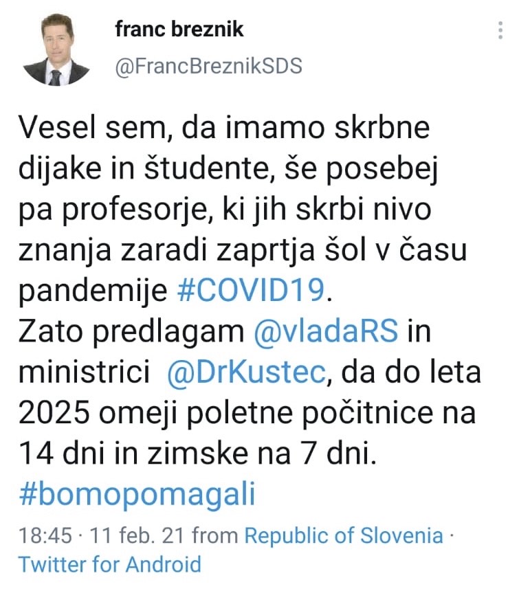 "Vesel sem, da imamo skrbne dijake in študente, še posebej pa profesorje, ki jih skrbi nivo znanja zaradi zaprtja šol v času pandemije covida-19. Zato predlagam vladi RS in ministrici Simoni Kustec, da do leta 2025 omeji poletne počitnice na 14 dni in zimske na 7 dni."