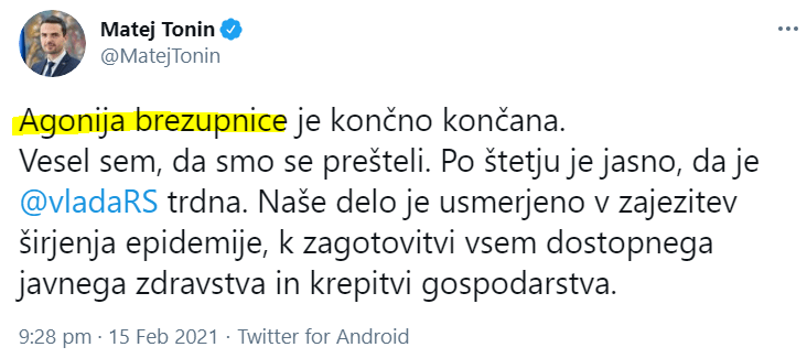 Matej Tonin je po ponedeljkovem preštetju glasov po neuspeli konstruktivni nezaupnici, ob kateri je svojo zgodovinsko vlogo odigralo trinajst poslank in poslancev, na koncu zelo zadovoljno tvitnil: "Agonija brezupnice je končno končana. Vesel sem, da smo se prešteli. Po štetju je jasno, da je @vladaRS trdna. Naše delo je usmerjeno v zajezitev širjenja epidemije, k zagotovitvi vsem dostopnega javnega zdravstva in krepitvi gospodarstva."