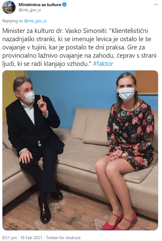 Politična aktivistka Norma Brščič iz ultradesničarske stranke Dom, ki jo vodi njen mož, v zadnjem času znana tudi po svojih rasističnih izpadih v oddaji Faktor na TV3 (PRO TV d.o.o.), izbira goste po svojem okusu, tokrat ministra za kulturo. Na svojem profilu je najavila temo novega pogovora: dr. Vasko Simoniti, v čigar družbi se je očitno dobro počutila in ji ta prav nič ne zameri opazk o temnopoltih in Afričanih, se je z njo pogovarjal o "nekulturnosti slovenskih kulturnikov" in tem, "kaj Slovenci dobimo za 238 milijonov evrov". Navedla je še tretjo, najbrž kar osrednjo točko in že kar agendo pogovora: "Zakaj je kultura postala leglo skrajnih levičarjev?"