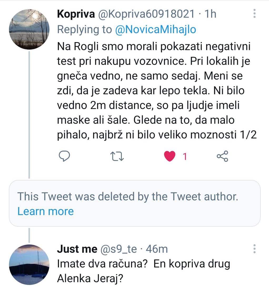 Kot Kopriva (@Kopriva60918021) je poslanka SDS ob komentiranju zapisa novinarja Dela Novice Mihajlovića o ukrepih, ki veljajo na smučiščih, zapisala, da je morala na Rogli ob nakupu vozovnice pokazati negativni izvid testa in da je vse skupaj z distanco in maskami potekalo brez težav. V nadaljevanju tvita, ki je bil objavljen na profilu poslanke SDS, je zapisala, da jo skrbijo gruče ljudi v mestih in na trgih, ki ne nosijo mask.