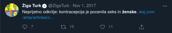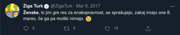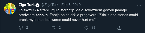 "Ok, katera je pa moja druga najbolj seksistična izjava? Ker bi jih po tej logiki moralo biti polno," se je na Twitterju vprašal Žiga Turk, nekdanji minister v Janševi vladi, prejemnik letošnje bodeče neže za najbolj seksistično izjavo leta. Pri odgovoru so mu pomagali nekateri uporabniki Twitterja (tvite objavljamo spodaj), ki so mu posredovali nekatere njegove pretekle zapise, da bi mu osvežili spomin. Žiga Turk je namreč prepričan, da je nečastna nagrada, ki jo je prejel, "nepoštena, nerazumna in nezaslužena".