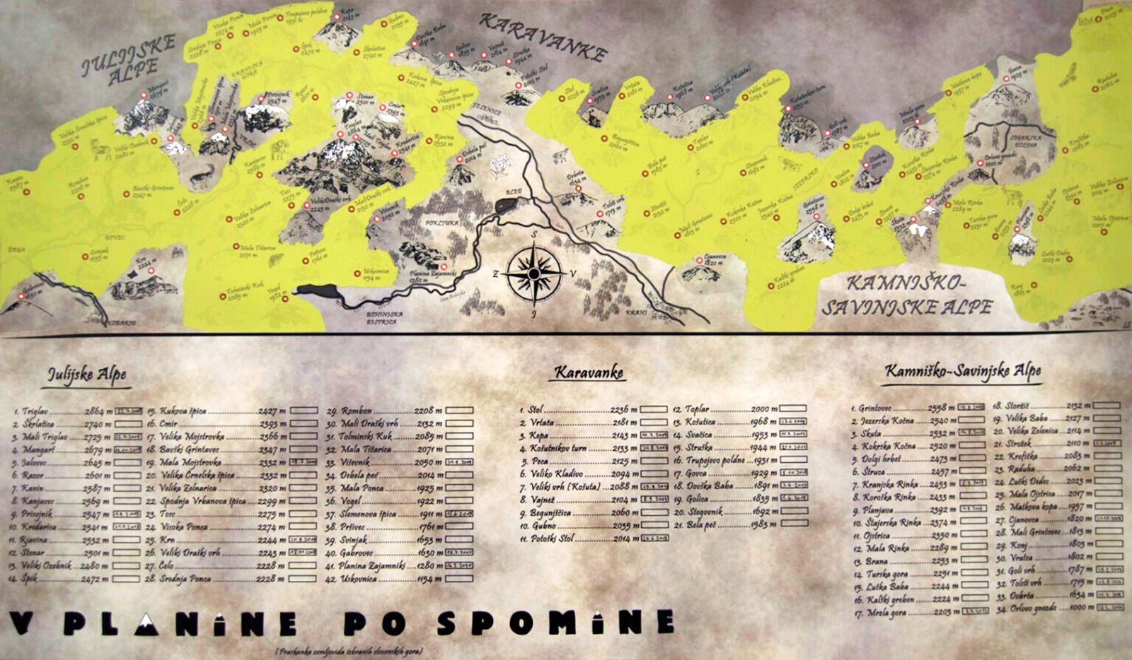 Narod zagrizenih hribolazcev, ki svoj najvišji vrh časti do te mere, da članstvo v plemenu pogojuje z njegovo osvojitvijo, je pred meseci končno dobil zemljevid, na katerem lahko ponosno beleži svoje planinske podvige. Imenuje se »V planine po spomine«, zasnovala pa sta ga ljubiteljska hribolazca, vzgojiteljica in inženir, kot piše v njuni predstavitvi na spletni strani. Na gorniškem zemljevidu je označenih 97 vrhov v Karavankah, Julijskih ter Kamniško-Savinjskih Alpah, prevlečenih s posebnim premazom. Tako predstavljajo skoraj sto zamisli za vzpone, izlete, pohode in so navdih za bolj ali manj sistematično osvajanje gora v domovini. Ob vsakokratni vrnitvi v dolino ali domov seveda zmagoslavno odpraskate osvojeni vršac, na spodnji polovici pa zemljevid prinaša tudi seznam posameznih vrhov, ob katerih je prostor za vpis datuma vzpona. Meri 92 krat 50 centimetrov in je primeren tako za dolgoletne, izkušene planince kot tiste, ki si bodo gojzarje nadeli prvič ter sčasoma pridobili kondicijo in gorniški zanos.