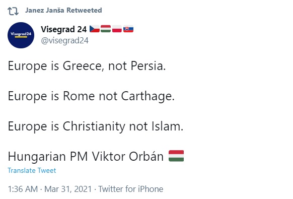 Tokratno naklonjenost je namenil zelo verjetno že staremu citatu njegovega prijatelja in političnega mentorja Viktorja Orbana, ki je leta 2016 ob protibegunski histeriji navedel niz ksenofobnih dihotomij, povezanih s "proevropsko" identiteto: k Evropi spada Grčija, ne pa Perzija, Rim in ne Kartagina (!), Evropa pa je krščanska, nikakor ne muslimanska.