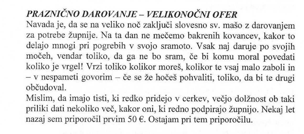 Župnik priporoča, da cerkvi darujete toliko, da vas vsaj malo zaboli
