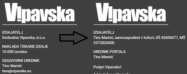 Arhivska stran Wayback Machine pokaže, da je kolofon portala vipavska.eu še lanskega 26. novembra prikazal, da je njihov izdajatelj Svobodna Vipavska, d. o. o., nato pa se je na tem mestu pojavilo ime Tina Mamića, prav tako blizu Novi Sloveniji. Vovk je danes zastopnik ali družbenik ali oboje v Zavodu Iskreni, Primorskem kariernem centru in Istra Group d.o.o.