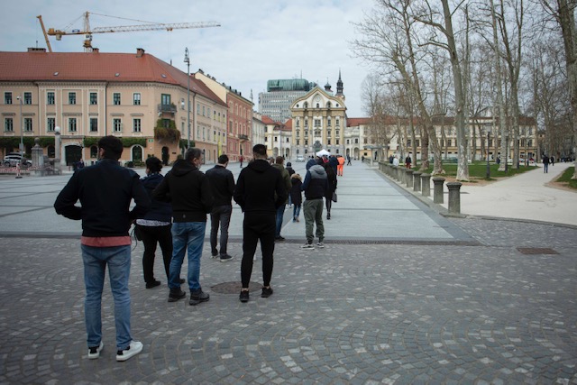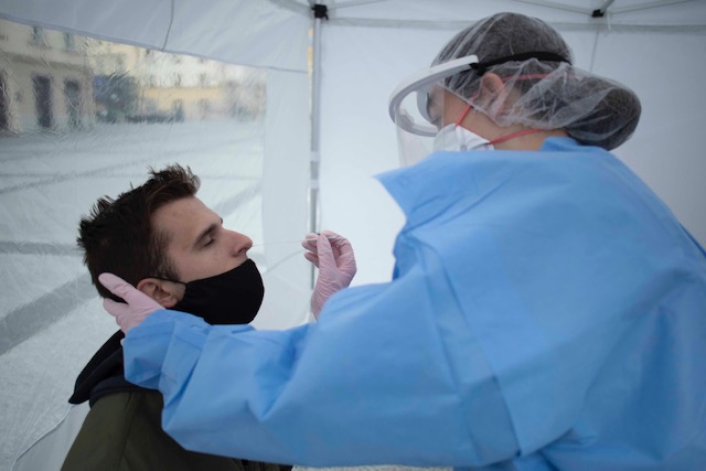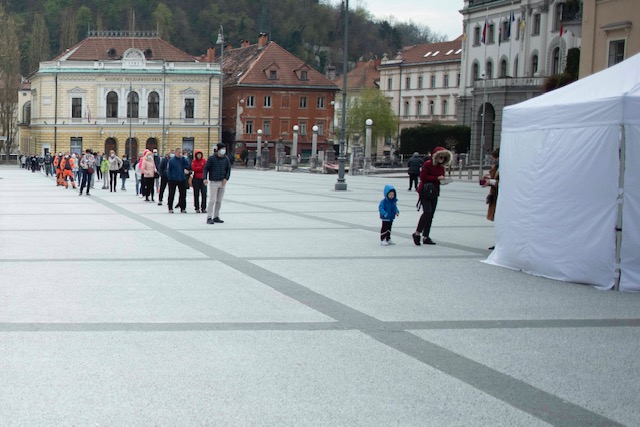 Fotograf Gašper Lešnik je danes na Kongresnem trgu v Ljubljani zabeležil dolgo vrsto za testiranje na covid-19.