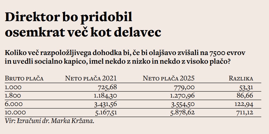 Potem predlagajo znižanje najvišje davčne stopnje s 50 odstotkov na 45, kar bo ponovno koristilo najbogatejšim 4323 oziroma tistim, katerih dohodki so višji od 8077 evrov bruto na mesec. Zvišanje splošne olajšave s sedanjih 3500 evrov na 7500 evrov leta 2025 bo sicer povprečnemu državljanu prineslo kakšnih 50 evrov na mesec več, a še enkrat več bo v žep prejel njegov direktor. Jasno je tudi, kdo bo čutil znižanje obdavčitve dohodkov od kapitala (npr. dividend) s 27,5 odstotka na 25 odstotkov ali znižanje davka na oddajanje nepremičnin s 27,5 odstotka na 15 odstotkov. Tega se lahko razveseli predvsem prvi odstotek najbogatejših, torej tisti, katerih večine dohodkov ne sestavlja plača, ampak najemnine in dividende.