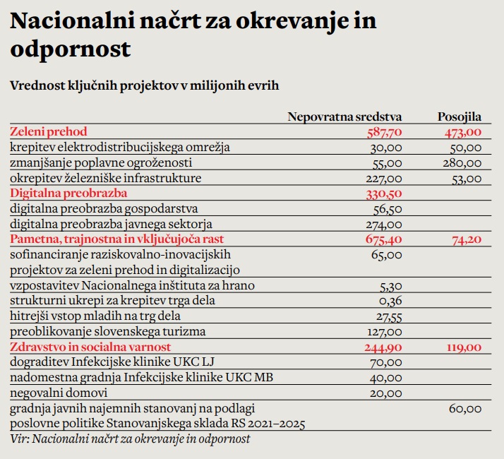Ko je Slovenija 21. junija lani dobila zeleno luč za črpanje 10,5 milijarde evrov za pokoronsko obnovo, je to predsednik vlade Janez Janša predstavil kot osebni triumf, kot »izkupiček, verjetno najboljši do zdaj«, kot »ambiciozen dogovor, ki je pomemben s finančnega in psihološkega vidika«. Dobra polovica tega denarja je (bila) vezana prav na Načrt za okrevanje in odpornost. Načrt, ki smo ga v Bruselj oddali prejšnji teden in bo zdaj dva meseca v presoji, pa predvideva črpanje 2,5 milijarde evrov, od tega 1,78 milijarde evrov nepovratnih sredstev in 666 milijonov evrov posojil.
