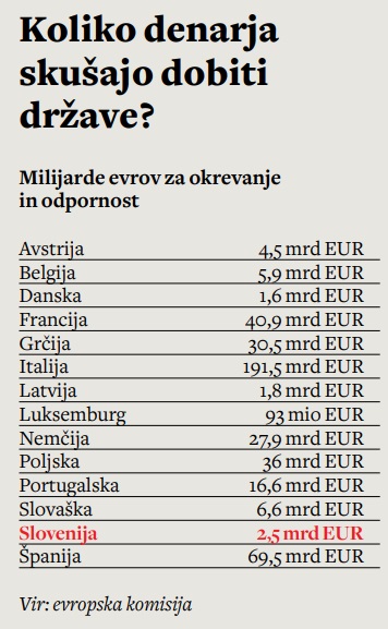 Slovenija je sicer načrt za odpornost in okrevanje oddala sočasno z Belgijo, Avstrijo in Italijo, ki so prek načrtov priglasile za 5,9 milijarde evrov, 4,5 milijarde oziroma Italija kar za 191,5 milijarde evrov projektov. Poljska, denimo, jih je priglasila za 36 milijard evrov, Nemčija za 27,9 milijarde in Luksemburg za zgolj 93 milijonov evrov.